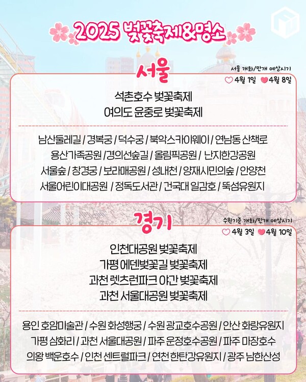 - 경기 벚꽃 개화: 4월 3일 (만개 4월 10일)